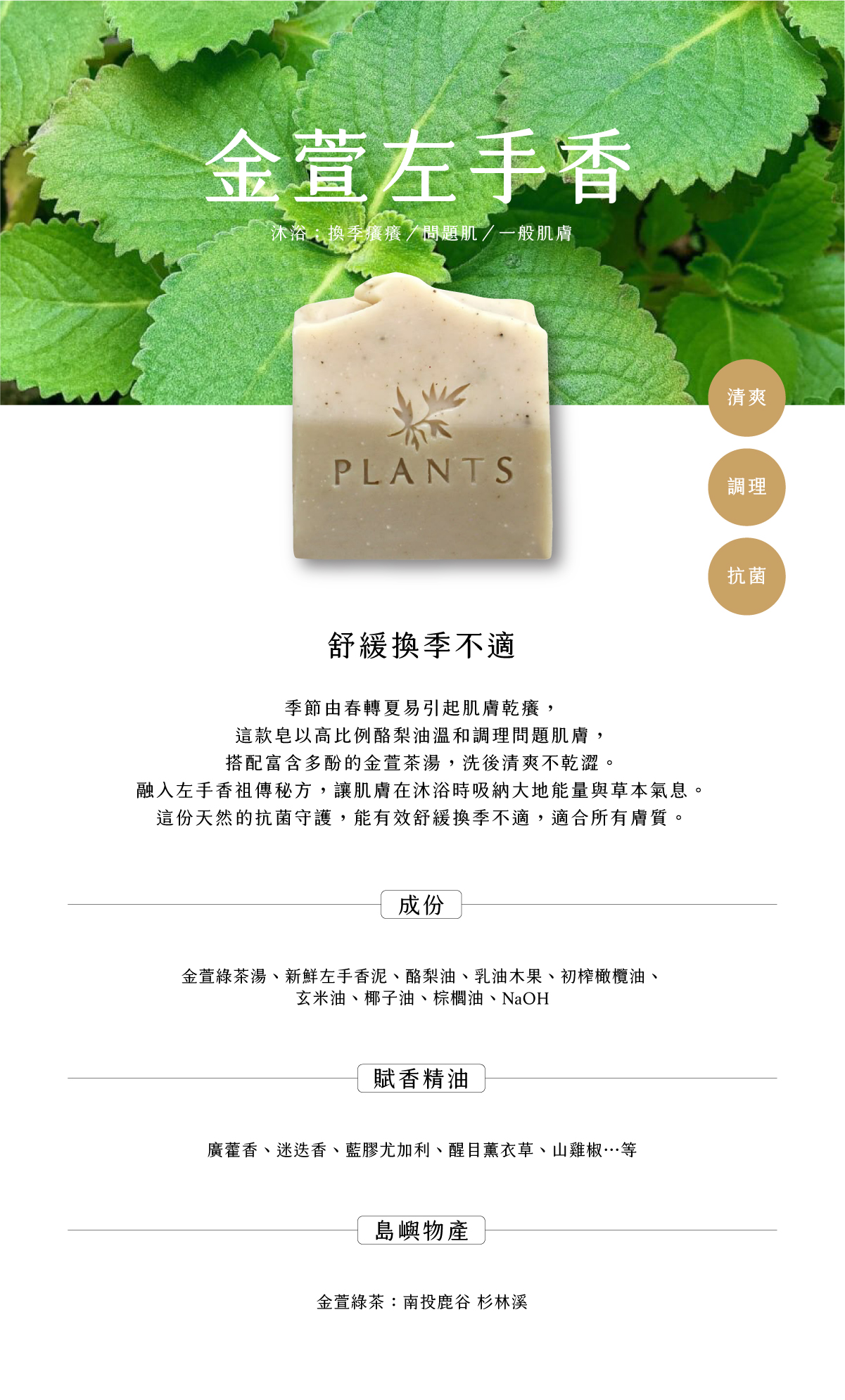 季節由春轉夏易引起肌膚乾癢,這款皂以高比例酪梨油溫和調理問題肌膚,搭配富含多酚的金萱茶湯,洗後清爽不乾澀。融入新鮮採集的「左手香」祖傳秘方,將鮮採的左手香挑選洗淨後打泥入皂,讓肌膚在沐浴時吸納大地能量與草本氣息。這份天然的抗菌守護,能有效舒緩換季不適,適合所有膚質。